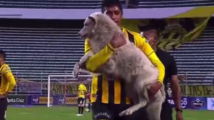 במהלך משחק כדורגל: כלב התפרץ למגרש ואומץ בידי שחקן מפורסם