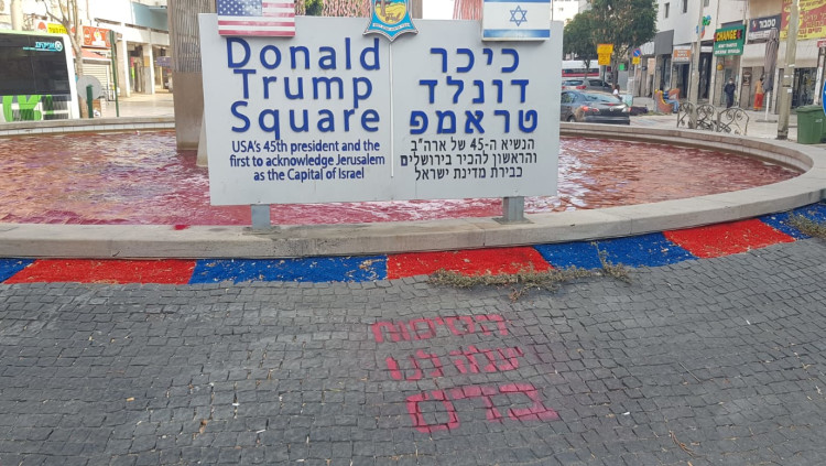 הכיכר האדומה: כתובות גרפיטי נגד הסיפוח רוססו בכיכר ע"ש טראמפ בפ"ת