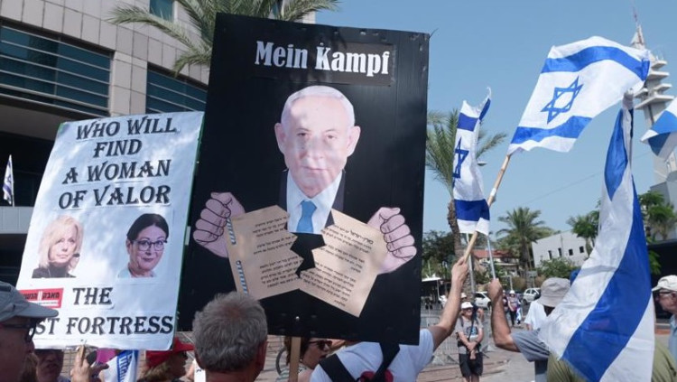 אירוע חריג במפגן התמיכה ביועמ"שית: תמונת נתניהו הוצגה עם שם ספרו של היטלר