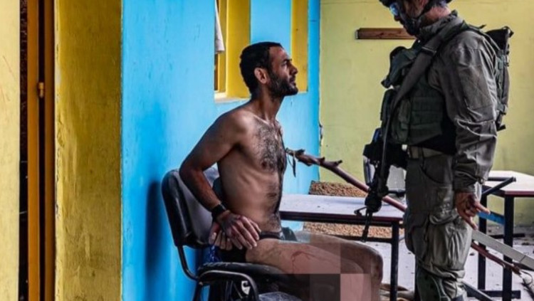 חייל צה"ל לצד עצור עזתי בתחתונים: התמונה שעוררה סערה ברשת