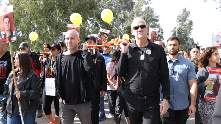 "איתכם במסע": גנץ וטרופר נכנסו "מתחת לאלונקה" בצעדת משפחות החטופים לירושלים