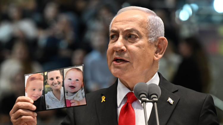 נתניהו הציג את תמונת משפחת ביבס; הקהל קרא: "למה לא החזרת אותם?"