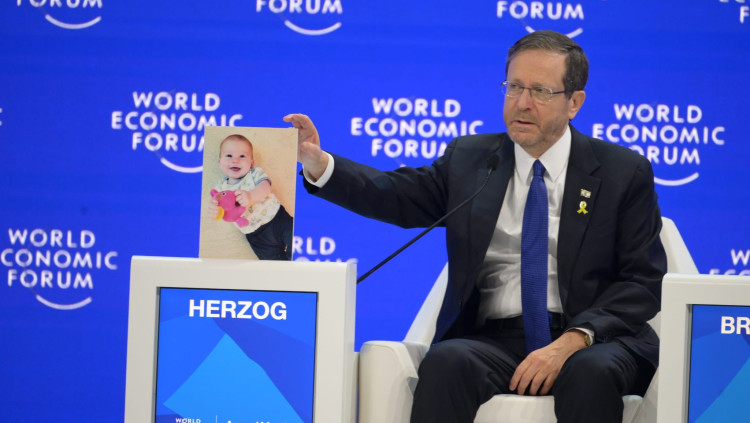 לציון יום הולדתו של התינוק החטוף כפיר ביבס: נשיא המדינה עם תמונתו על בימת הכנס הכלכלי העולמי בדאבוס
