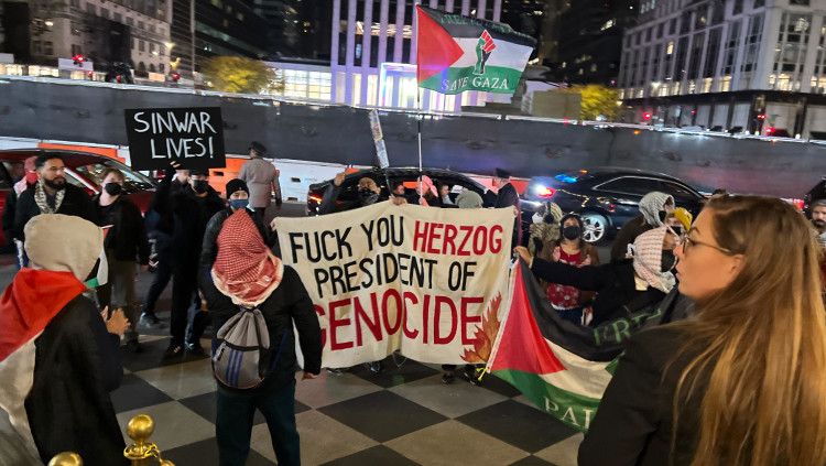 עשרות צעירים פרו-פלסטינים מפגינים נגד הנשיא הרצוג מחוץ למלון בניו יורק