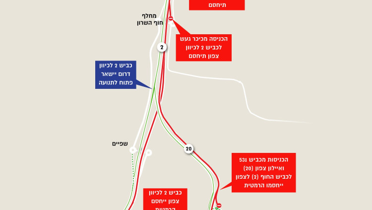 כביש החוף (2) לכיוון צפון ייחסם הלילה לתנועה ממחלף רבין ועד פולג