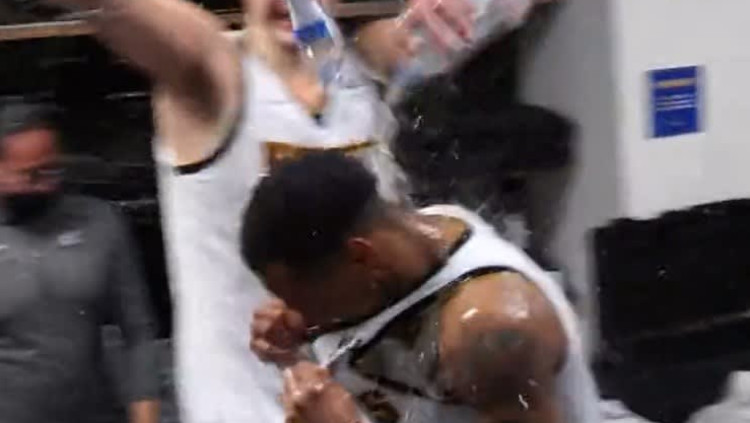 שחקני דנבר נאגטס חוגגים בחדר ההלבשה ניצחון על הווריירס אחרי סל ניצחוןשל מונטה מוריס