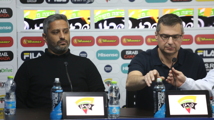 ברק יצחקי מדבר יחד עם ג'ק אנגלידיס במסיבת העיתונאים של מכבי תל אביב