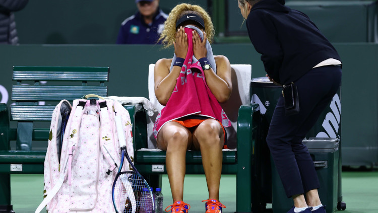 הטניסאית היפנית נאומי אוסקה בוכה באמצע משחק בטורניר אינדיאן וולס