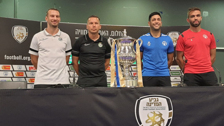 קפטן הפועל באר שבע מיגל ויטור לצד אליניב ברדה, מאמן מכבי חיפה ברק בכר ליד שון גולדברג
