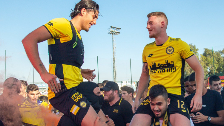 יובל שדה, עומרי גנדלמן שחקני מכבי נתניה על כתפי האוהדים