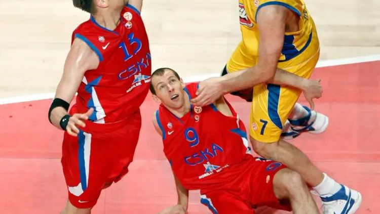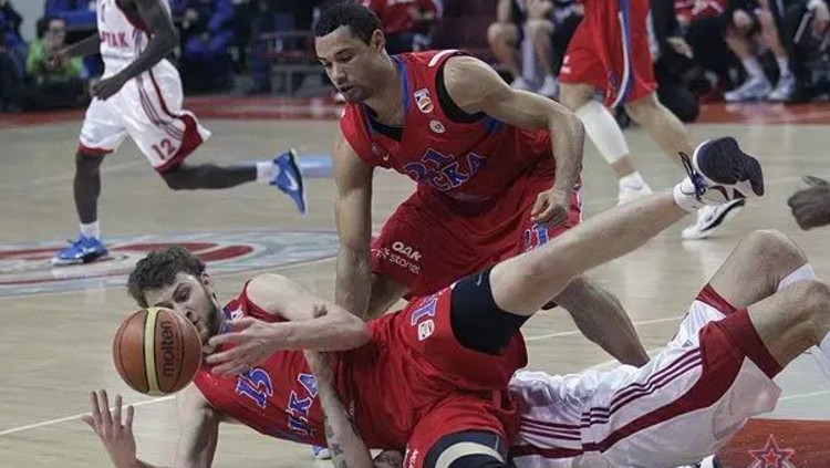 שחקן צסק"א מוסקבה לשעבר ארטיום זבלין (משמאל) מול שחקן מכבי תל אביב לשעבר ניקולה וויצ'יץ'