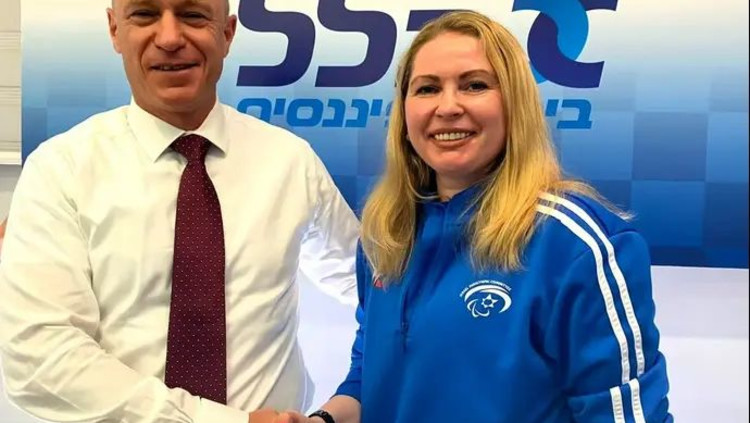 הקלעית הפראלימפית, יוליה צ'רנוי, לצד יורם נוה, מנכ"ל כלל ביטוח ופיננסים