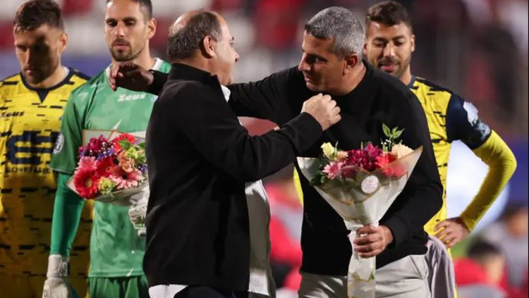 שרון מימר מאמן מכבי בני ריינה מקבל פרחים מידי מוחמד אבו יונס יו"ר בני סכנין