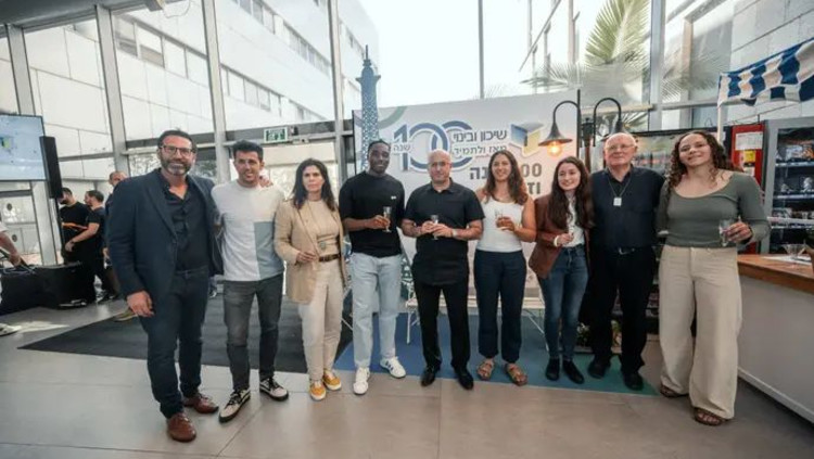 מימין לשמאל: תמר שטיינברג, גילי לוסטיג, אולגה טסצ'יאב, שרון קנטור, תמיר כהן (מנכ"ל שיכון ובינוי), בלסינג אפריפה, יעל ארד, שחר צוברי, דן מויאל (סמנכ"ל שיווק ומכירות בשיכון ובינוי)