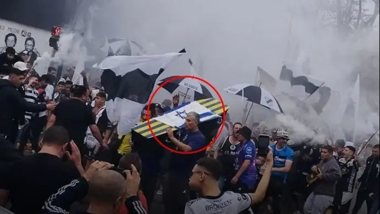 אוהדי אול בויס הארגנטיאית מציגים ארון קבורהה עם דגל ישראל