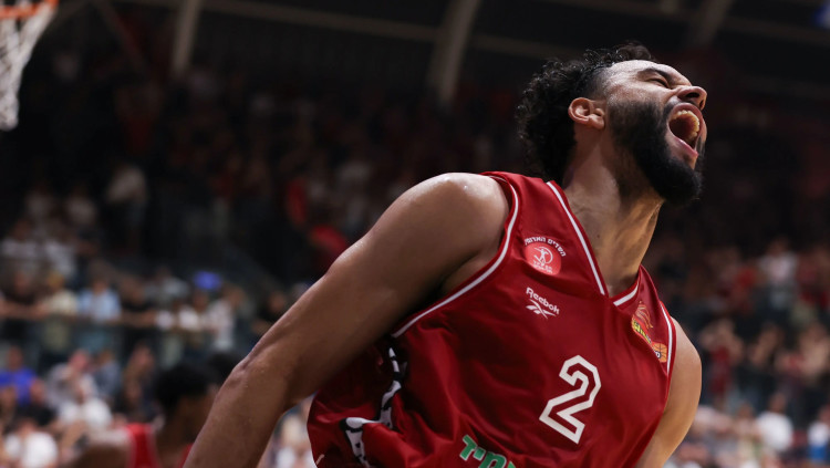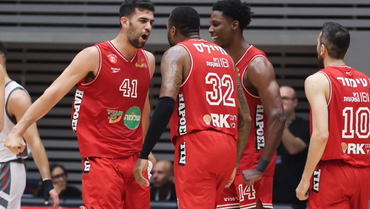 שחקני הפועל תל אביב חוגגים: תומר גינת, אייזיאה מיילס, ג'יילן הורד, בר טימור