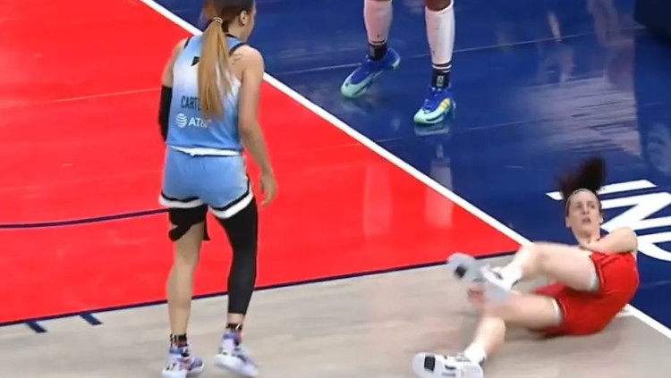 קייטלין קלארק סופגת מהלומה וקללה מיריבה במהלך משחק WNBA