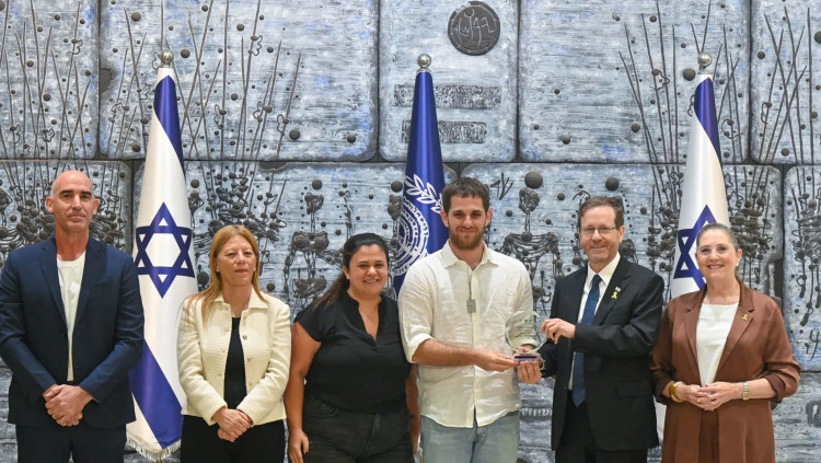 נשיא המדינה יחד עם זוכי הציון לשבח עבור עשייה חברתית-קהילתית במלחמה: מועדון הכדורגל הפועל תל-אביב