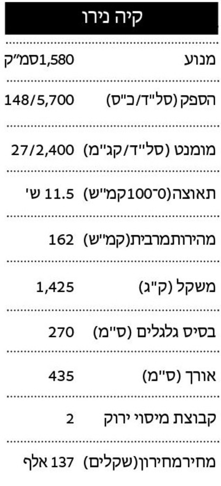 רק יצאתי ממגרש החניה והתנפל עלי ברנש מסוקס ושאל אם זו הנירו החדשה ואם היא כבר על המדפים, מוכנה למכירה. הרי מה הישראלי החדש מחפש במגרש החניה? קרוס–אובר משפחתי. דמוי ג'יפון, להגיד שהוא נוהג בג'יפ, אבל רק כמו. לא ממש. הוא רוצה מראה חיצוני מזמין, אבל שבאותה מידה יהיה חסכוני ונקי. זו בדיוק נירו.