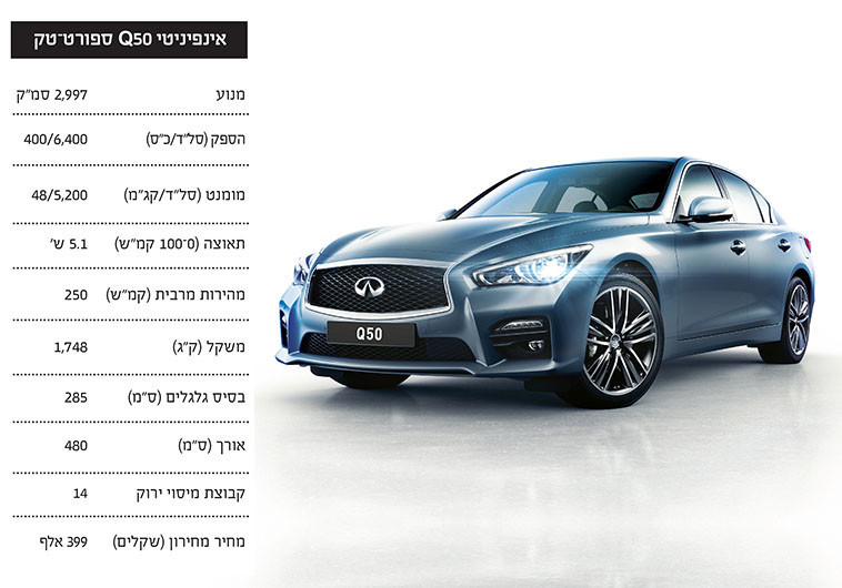 טוב, זו לא עוד Q50, זו גרסת הספורט–טק היוקרתית. זו שיש לה הנעה אחורית, מנוע 3,000 סמ"ק, שישה צילינדרים. רק הנחתי את הרגל על דוושת הגז, אפילו לא בכל הכוח, וכל 400 הסוסים שהיא מחזיקה באורווה שוחררו לחופשי.