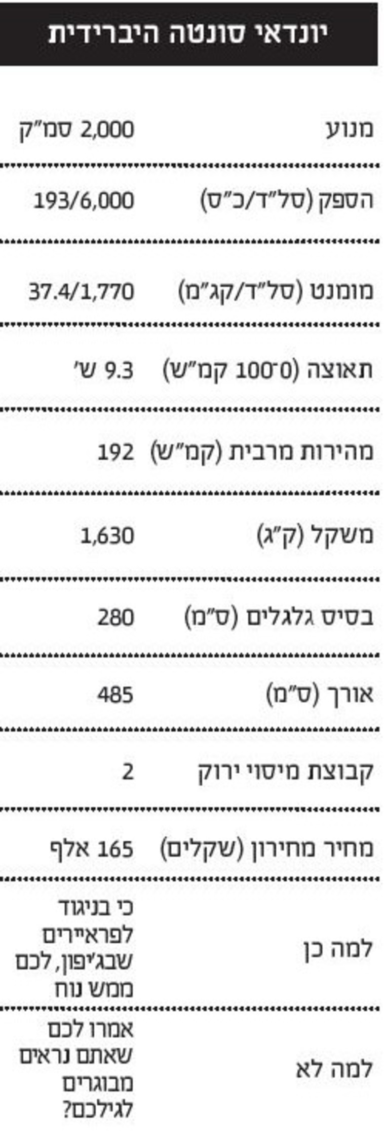 כיול המתלים הוא על הצד הנעים והרגוע של הסקאלה. גם בידוד הרעשים עושה עבודה נאמנה ומרשימה, למרות הנהיגה ביום חורפי שרק ביקש להכניס לתוך התא המשפחתי את רעשי הרוחות שהשתוללו בחוץ. שמענו, אבל בגבולות הטעם הטוב. סונטה מגיעה אלינו עם מנוע בנפח 2,000 סמ"ק, המשלב מנוע חשמלי עם סוללת ליתיום–פולימר. ההספק המשולב של המנועים הוא 193 כ"ס, עם 37.4 קג"מ, שמושגים כבר ב–1,770 סל"ד.