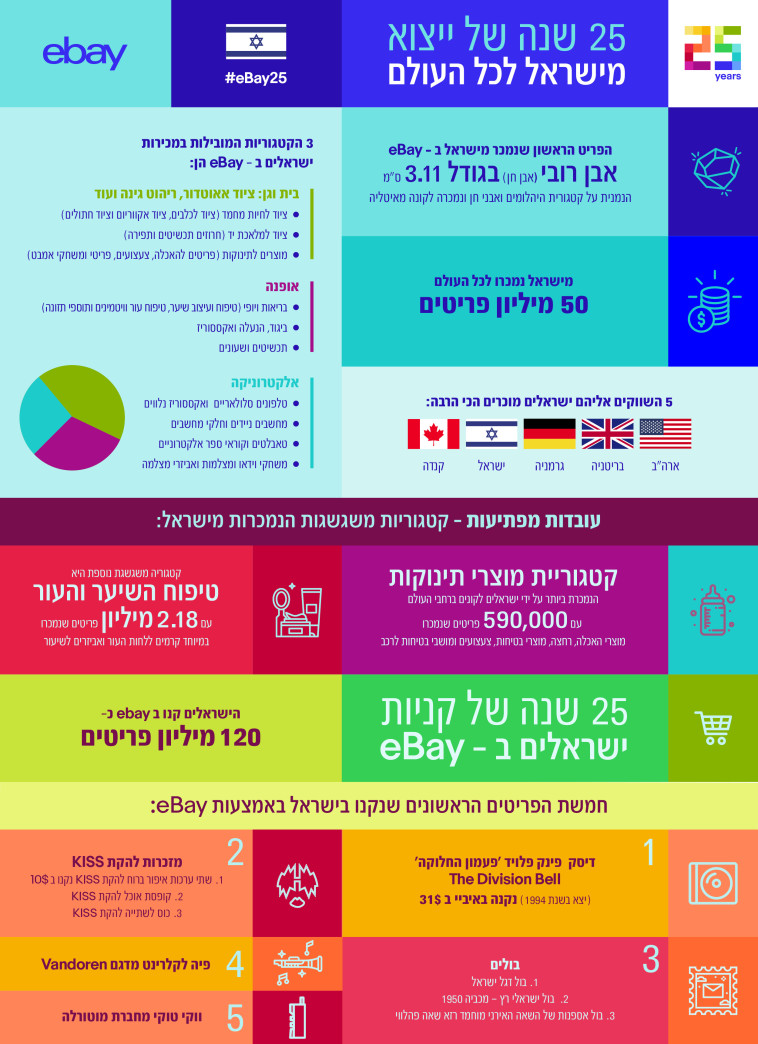 ענקית המסחר איביי חוגגת בימים אלה 25 שנה להיווסדה, ולרגל המועד פורסמו נתונים רבים אודות המסחר של הישראלים לפלטפורמה. לאורך השנים, הישראלים מכרו למעלה מ-50 מיליון פריטים, כאשר הפריט היקר ביותר שנמכר עד כה מישראל הוא אבן יהלום טבעית בצבע ורוד, 5.09 קראט. היא נמכרה בשנת 2018, תמורת 60 אלף דולרים. הפריט הראשון שנמכר מישראל, הוא אבן רובי (אבן חן) בגודל 3.11 ס"מ הנמנית על קטגוריית היהלומים ואבני חן. האבן נסעה עד לאיטליה.