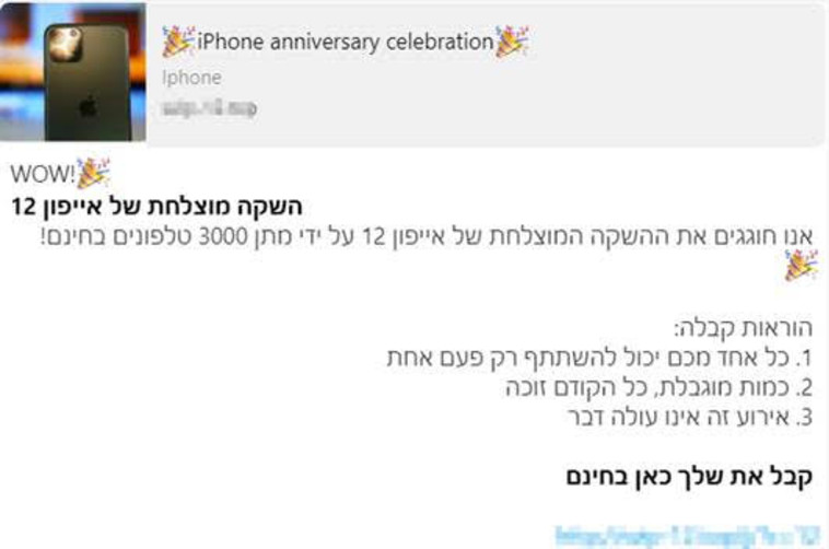 חברת אבטחת המידע ESET דיווחה על הונאה חדשה המופצת בוואטסאפ בימים אלה, ומבטיחה לישראלים אייפונים במתנה. "אנו חוגגים את ההשקה המוצלחת של אייפון 12 על ידי מתן 3000 טלפונים בחינם", נכתב בהודעה.
