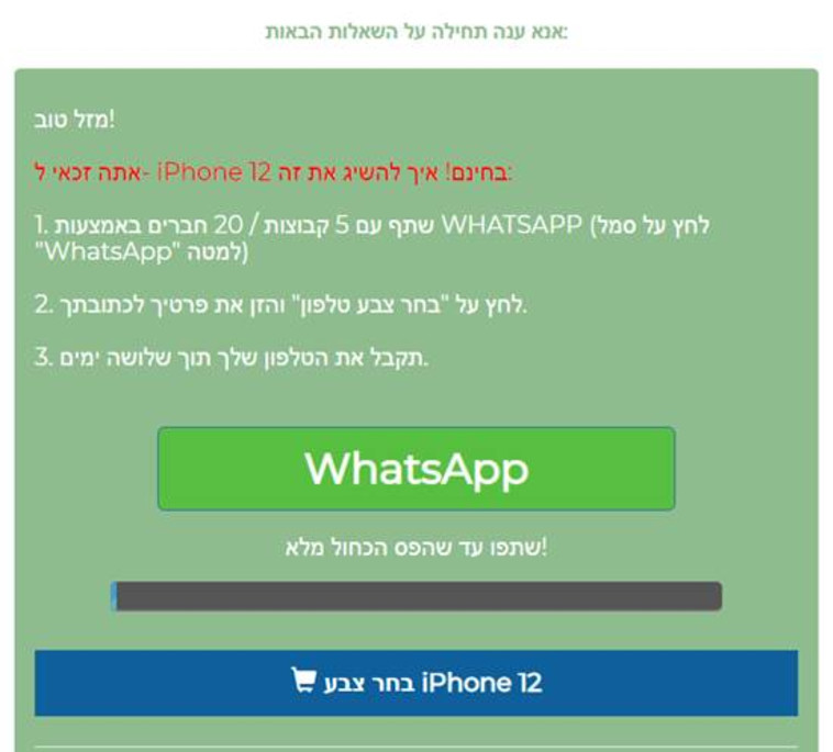 הגולשים שהשיבו על השאלות מקבלים הודעה בה נכתב: "מזל טוב אתה זכאי ל-iphone 12 בחינם. איך להשיג את זה?". בהמשך, הם מתבקשים להפיץ את ההודעה הלאה על מנת להמשיך להשתתף ולזכות בפרס.