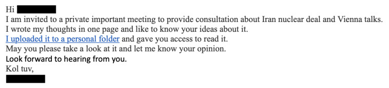 במהלך התקופה בה התוקפים האיראנים פעלו (עד לשבוע שעבר), הם הצליחו לשים את ידם על תכתובת מייל פרטית בין ראש מכון מחקר מרכזי מאד בישראל ושגריר ארה"ב לשעבר בישראל, וניצלו אותה ליצירת המשך התכתבות במהלכה הם התחזו לשגריר תוך שימוש במייל אחר. בהמשך, הם שלחו לראש המכון קבצים העוסקים לכאורה בתכנית הגרעין האירנית והשתמשו בלינק המשומש למתקפות דיוג (איתו ניתן לקצר כתובות URL).