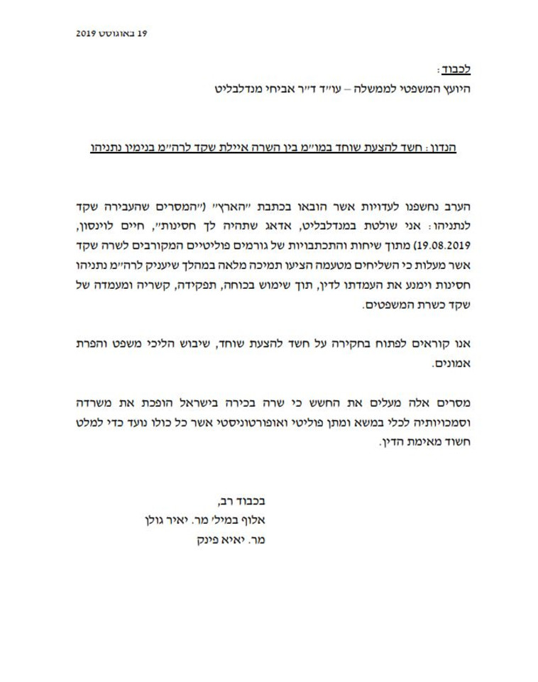 במערכת הפוליטית דורשים מהיועץ המשפטי לממשלה אביחי מנדלבליט לפתוח בחקירה נגד יו"ר ימינה, שרת המשפטים לשעבר איילת שקד. זאת בעקבות פרסום ב"הארץ", לפיו, שליחים מטעמה של שקד הציעו לראש הממשלה בנימין נתניהו להשפיע על מנדלבליט לטובתו תמורת הסרת התנגדותו להצטרפותה לליכוד.