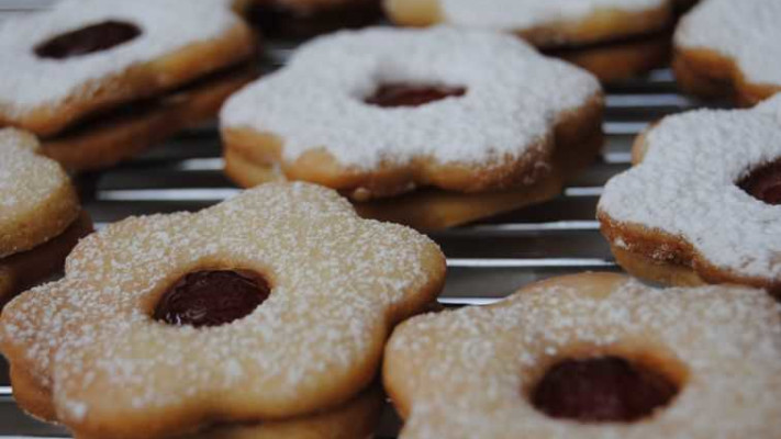 אופים 22 דקות בחום של 180 מעלות, בתנור שחומם מראש. מצננים. בעזרת כפית מניחים מעט ריבה במרכז העוגיות השלמות. מכסים בעזרת העוגיות עם החור ומפדרים באבקת סוכר.