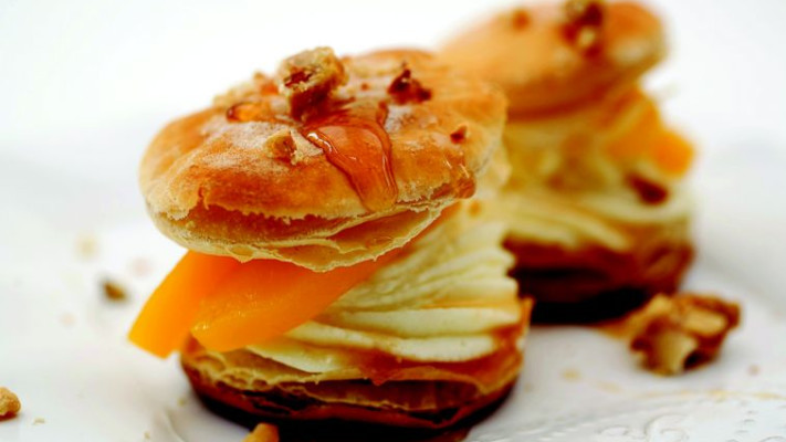 ואי אפשר בלי קינוח. אחת המנות המתוקות והאהובות על בני משפחתי היא עוגת קרם שניט, המוכרת כעוגת נפוליאון. אולם כדי להגיע לתוצאה מצוינת העוגה דורשת זמן הכנה ממושך. מצאתי דרך קיצור מפתיעה לימים שבהם זמני קצר: מלאווח. השתמשתי בעלי מלאווח מוכנים כבסיס לבצק ומהם חרצתי מספר עיגולים בהתאם למנות הרצויות. הכנתי קרם מהיר, שילבתי פלחי אפרסקים משומרים, ותוך זמן קצר התקבלה מנה אחרונה שכמו מתנה היא יפה, ומפתיעה.