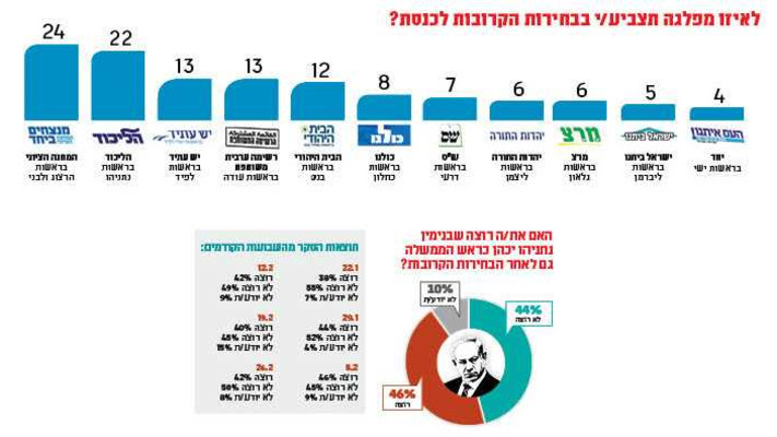 1. השבוע החזק של נתניהו מסתכם, בינתיים, באפס מנדטים. זה מוזר, כי במספרים האישיים נתניהו השיג השבוע שיפור ניכר: בשבוע שעבר 50% מהציבור לא רצו אותו לקדנציה נוספת ו־42% רצו (מדד מינוס 8), השבוע 46% רוצים אותו קדנציה נוספת ו־44% לא רוצים (מדד פלוס 2). זה שיפור יפה כשמדובר בשבוע אחד, אבל הוא לא מתורגם למנדטים: 23־25 להרצוג בשבוע שעבר, 22־24 להרצוג השבוע. תקוע.
