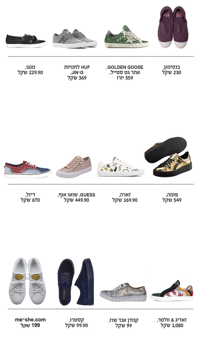 לכל עונה יש לפחות פריט חובה אחד. כבר בקיץ שעבר זכו הסניקרס בתואר הזה, הטרנד נמשך גם בקיץ הנוכחי ולא נראה שיעזוב אותנו בעתיד הנראה לעין. וטוב שכך, כי הנעליים האלה פשוט מושלמות לכל מצב רוח ולכל מראה. הסניקרס שוב עלו על המסלול לאחר ששינו את ייעודן: כבר לא רק פריט ספורטיבי למכון כושר, אלא פריט אופנתי וטרנדי שמתאים לכל פעילות. עם ג'ינס וטי־שירט לבית הקפה השכונתי או בשילוב שמלה או חצאית מוקפדת לשעות הערב. אין כללים.