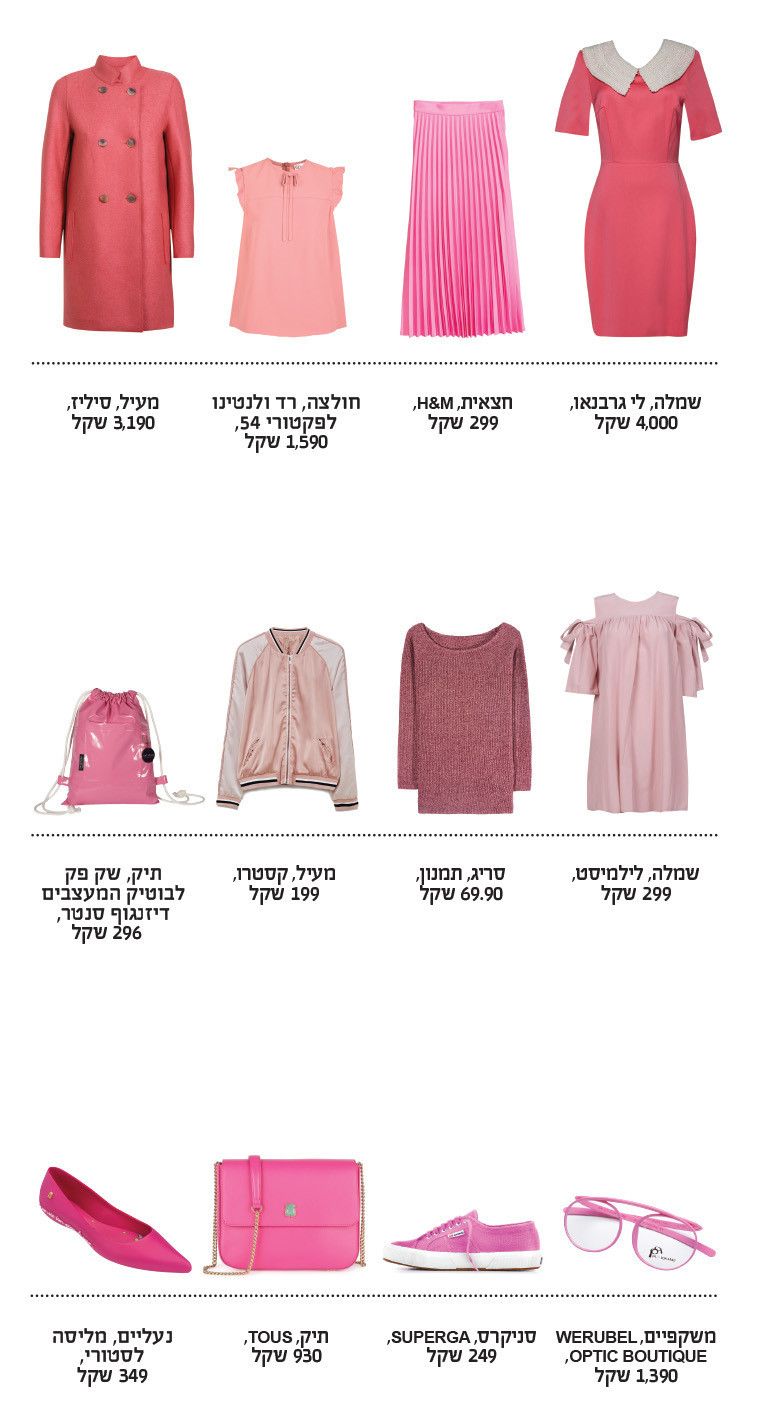 וכשהמעיל ורוד, הוא נותן את הטון לכל הלוק ויוצר אוטומטית תחושה של מראה יותר צעיר ואופטימי. מי שמתקשה לוותר על המעיל השחור ולהחליף אותו בוורוד, יכולה לקבל את זריקת הצבע שלה על ידי מגוון של שמלות, חצאיות, נעליים ואקססוריז שיאירו את היום.