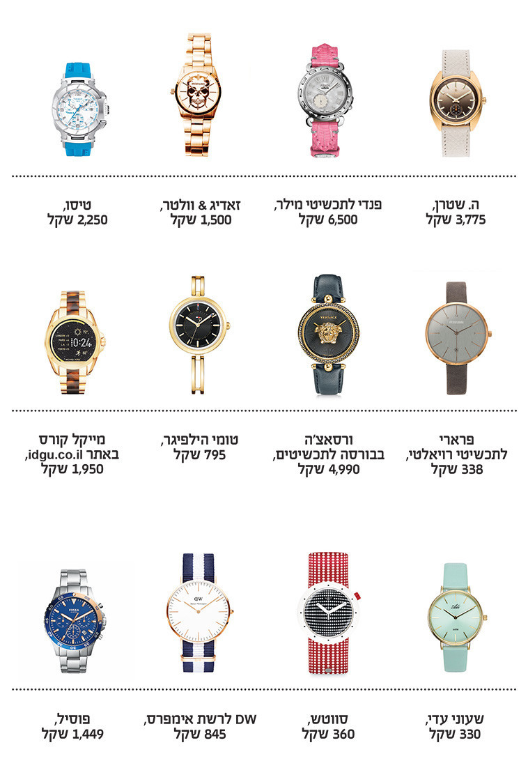 הלילה עברנו סוף־סוף לשעון קיץ, וזו בהחלט סיבה למדור מיוחד. אם בעבר היה מי שחשב ששעוני היד ייעלמו ככל שהתלות שלנו במכשירים הסלולריים תתעצם, הרי שההפך בדיוק קרה, ושעוני היד כאן כדי להישאר. אנחנו לא ממש צריכים אותם כדי לדעת מה השעה, אבל אנחנו צריכים אותם כדי לשדר יוקרה ואופנתיות. ומכיוון שאנחנו רוצים לשדר יוקרה, שעונים ממותגים עולים בהתאם. ובעוד פשוטי העם ייאלצו להיפרד מכמה עשרות שקלים כדי לקנות שעון, בעלי הממון ייפרדו ממאות עד אלפי שקלים כדי לענוד את השעון הנכון. אז נכון ששעונים אלה יהיו מעוטרים באבני חן ויהלומים, אבל בכל זאת, מדובר בהוצאה שערורייתית עבור פריט קטן כזה. בין החברות המציעות שעונים בהתאם לטרנדים הבינלאומיים תמצאו את פוסיל, מייקל קורס, טומי הילפיגר וורסאצ'ה. הטרנדים הבולטים הם: שעונים שחורים, שעונים בצבעי פסטל, בציפוי זהב צהוב וזהב גולד, גוני כחול וחום, שילובים של חומרים וחזרה של רצועות העור הוותיקות לצד רצועות מחומרים חדשניים וקלים.