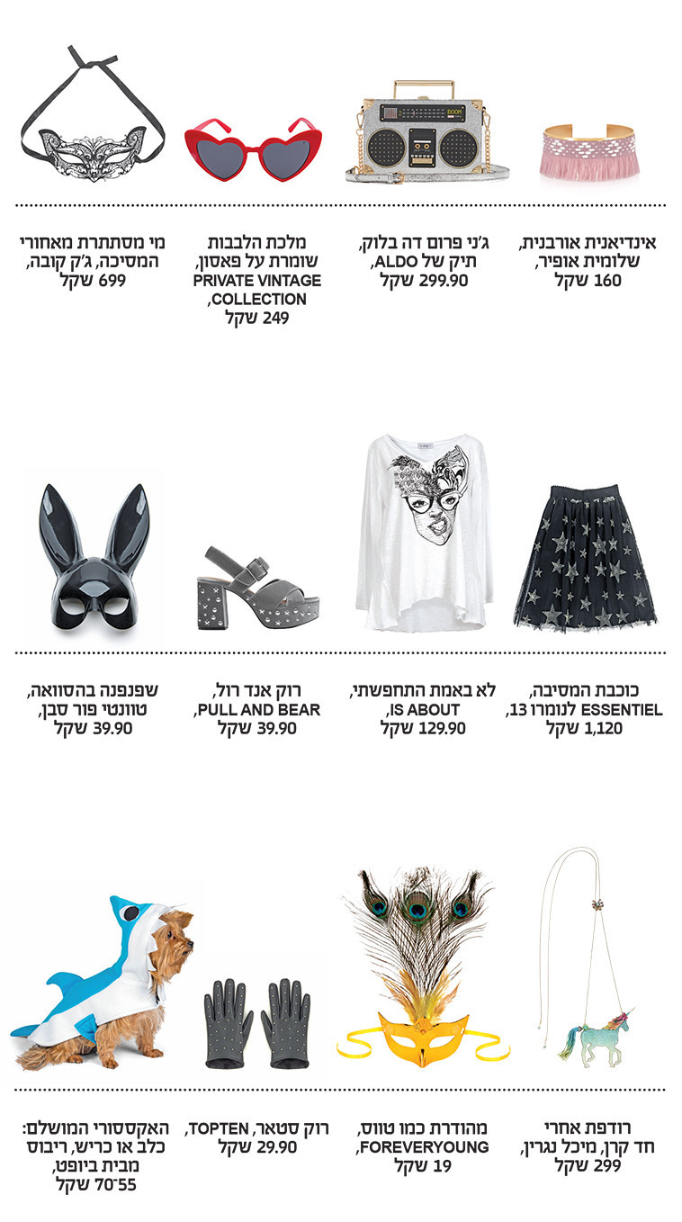 לצד שלל האביזרים תוכלו למצוא בחנויות תחפושות מוכנות מראש למבוגרים במחירים נוחים, כמו אלו שמציעה המעצבת שושי זוהר. אז אם אתן הולכות על תחפושת מוכנה וגם אם לא, הנה כמה פריטים שיעזרו לכן להעלות את רמת מצב הרוח.