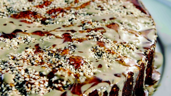 מעבירים לתבנית ומשטחים. בוזקים על העוגה את גרגירי השומשום. אופים בתנור שחומם מראש לחום בינוני (180 מעלות) כ-30 דקות ומצננים.