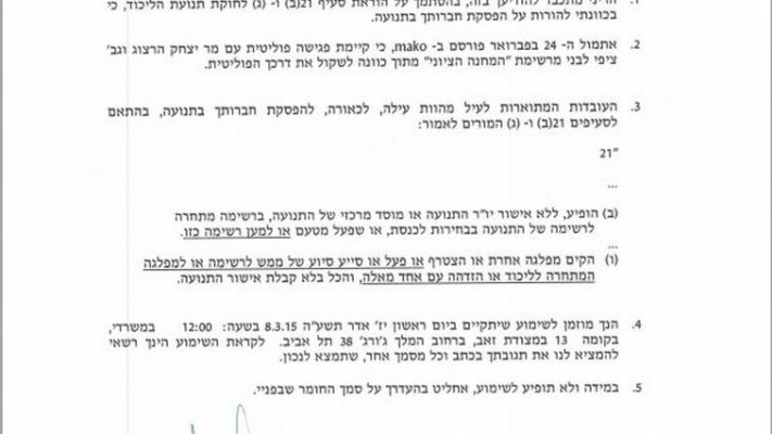 מנכ"ל המפלגה, גדי אריאלי כתב במכתב שהוציא כי "הריני מתכבד להודיעך בזאת, בהסתמך על חוקת התנועה, כי בכוונתי להורות על הפסקת חברותך בוועד. אתמול פורסם כי קיימת פגישה פוליטית עם הרצוג ולבני מתוך כוונה לשקול את דרכך הפוליטית. העובדות המתוארות מהוות עילה להפסקת חברותך". בהמשך ציטט המנכ"ל, גדי אריאלי את חוקת הליכוד וקבע שימוע ביום ראשון הקרוב. כמו כן, הוחלט כי במידה ולא יגיע לשימוע, תהיה ההחלטה של מנכ"ל המפלגה.