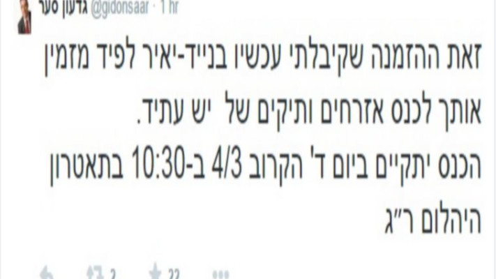 בשעות הצהריים צייץ סער בטוויטר: "זאת הזמנה שקיבלתי עכשיו בנייד מיאיר לפיד: 'מזמין אותך לכנס אזרחים ותיקים של יש עתיד בתיאטרון היהלום ברמת גן. כנראה אקסקלוסיבי לפנסיונרים'. כמובן שסער החליט לשתף בעניין את לפיד ותייג אותו. שר האוצר לשעבר לפיד השיב בציוץ משלו וכתב: "מה, לא? לא אמרו שפרשת?"