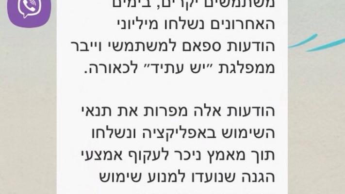 חברת "וייבר", הנותנת שירות לשיחות והודעות חינם למשתמשי מכשירי סמארטפונים, הוציאה היום (חמישי) הודעה ללקוחותיה שמפלגת "יש עתיד" בראשותו של יאיר לפיד, הוציאה מיליוני הודעות מאלפי חשבונות משתמשים רשומים.