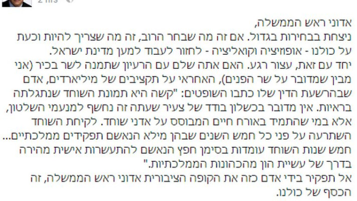 בסטטוס שהעלה לחשבון הפייסבוק פנה שר האוצר לנתניהו וכתב: " אדוני ראש הממשלה, ניצחת בבחירות בגדול. אם זה מה שבחר הרוב, זה מה שצריך להיות וכעת על כולנו - אופוזיציה וקואליציה - לחזור לעבוד למען מדינת ישראל. יחד עם זאת, עצור רגע. האם אתה שלם עם הרעיון שתמנה לשר בכיר (אני מבין שמדובר על שר הפנים), האחראי על תקציבים של מיליארדים, אדם שבהרשעת הדין שלו כתבו השופטים: "קשה היא תמונת השוחד שנתגלתה בראיות. אין מדובר בכשלון בודד של צעיר שעתה זה נחשף למנעמי השלטון, אלא במי שהתמיד באורח חיים המבוסס על אדני שוחד. לקיחת השוחד השתרעה על פני כל חמש השנים שבהן מילא הנאשם תפקידים ממלכתיים... חמש שנות השוחד עומדות בסימן חפץ הנאשם להתעשרות אישית מהירה בדרך של עשיית הון מהכהונות הממלכתיות".