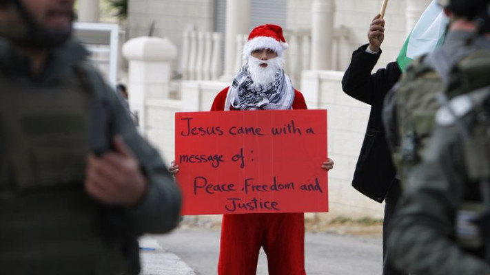 מפגין פלסטיני, שהתחפש לסנטה קלאוס, הופיע היום בבית לחם, והשתתף בהפגנה שנערכה במקום. בתמונה ניתן לראות את סנטה, עומד מול שוטרי מג"ב במהלכה של התקבצות הקוראת לאשר תנועה חופשית של הפלסטינים במהלך חג המולד בגבול הגדה המערבית.