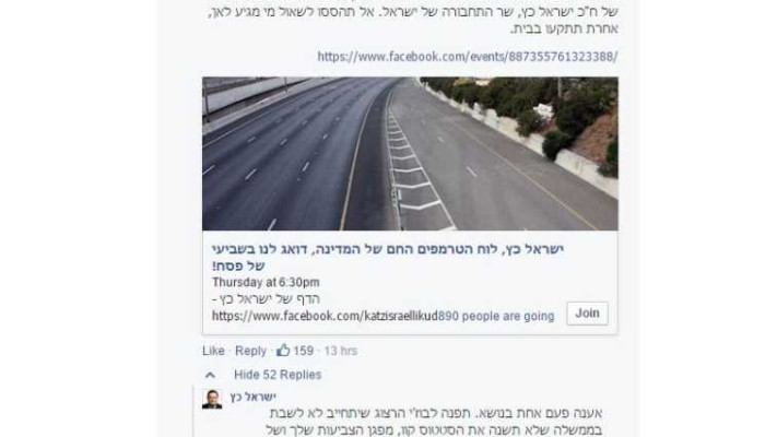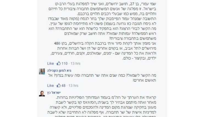 עימות בין שר התחבורה לגולש שפתח בעמוד לו דף לחיפוש טרמפים בסוף השבוע הקרוב: "מפגן הצביעות שלך ושל חבריך לעמותות השמאל הוכח בבחירות האחרונות וקיבל את התשובה ההולמת בקלפי"