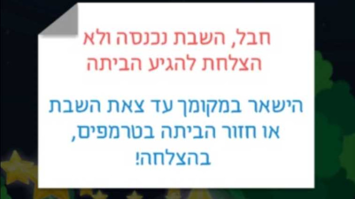 בסוף המשחק, אם החייל או החיילת נכשלים במשימה להגיע הביתה, מתקבלת ההודעה הבאה: “חבל השבת נכנסה. לא צלחת להגיע הביתה. השאר במקומך עד צאת השבת או חזור הבית בטרמטפים. בהצלחה”. את המשחק חותמת האמרה: "הכנע לישראל כ"ץ”.