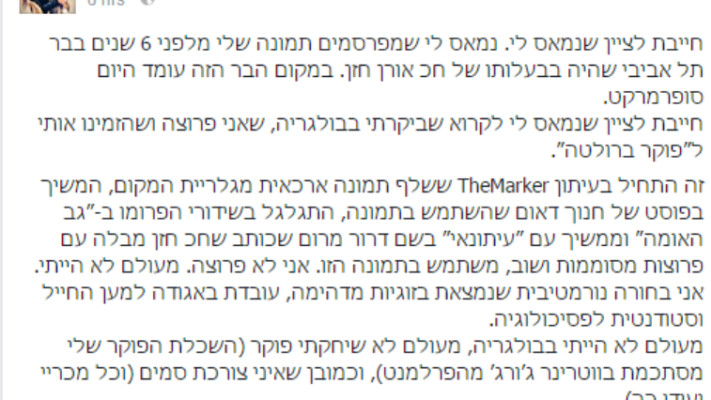 גרייבר כותבת בין היתר: "חייבת לציין שנמאס לי. נמאס לי שמפרסמים תמונה שלי מלפני שש שנים בבר תל אביבי שהיה בבעלותו של ח"כ אורן חזן. חייבת לציין שנמאס לי לקרוא שביקרתי בבולגריה, שאני פרוצה ושהזמינו אותי ל״פוקר ברולטה״.