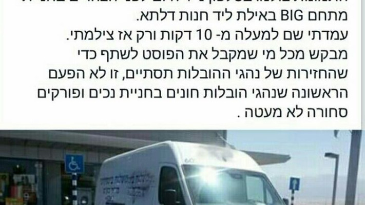 לפני מספר ימים הבחין תושב אילת ברכב מסחרי של חברת שליחויות שחונה בחניית נכים במרכז מסחרי בעיר. החנייה בחניית הנכים עוררה את זעמו של התושב שמיהר להעלות פוסט לפייסבוק בצירוף תמונה.