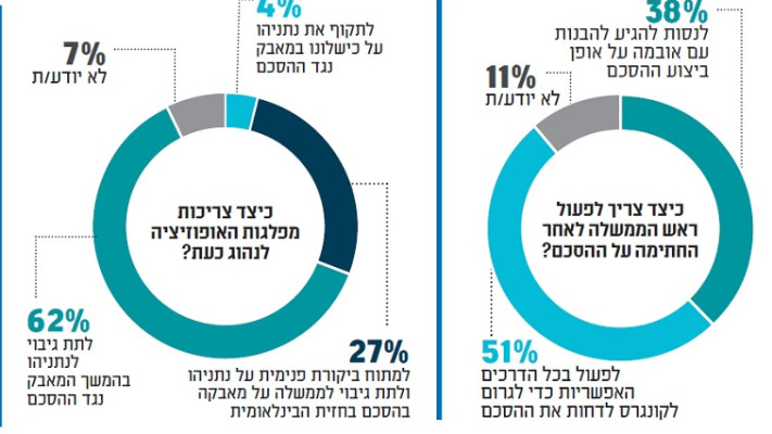 כשנשאלו כיצד מפלגות האופוזיציה צריכות לנהוג, ענו שליש מהמשיבים כי עליהם למתוח ביקורת פנימית על נתניהו בגין התנהלותו מול הממשל, אולם לתת גיבוי לממשלה במאבקה. שני שלישים מהמשיבים טענו שבכל מקרה יש להניח את הביקורת בצד ולהעניק רוח גבית לראש הממשלה בהמשך המאבק.