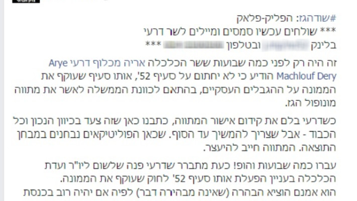 בתגובה לכך, עמוד הפייסבוק "צדק חברתי - חדר המצב" העלה פוסט ובו הוא פרסם את הנייד של השר וכן את המייל שלו וקורא להפעיל עליו לחץ ולכתוב לו כי הוא צריך לבחור צד - הטייקונים או האינטרס הציבורי.