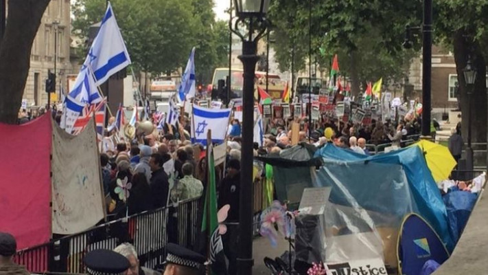 מנגד, מפגינים פרו ישראלים חיכו גם לנתניהו והם התייצבו עם שלטים ודגלים ברחוב דאונינג, סמוך למעון ראש ממשלת בריטניה, כשהמשטרה חוצצת ביניהם.
